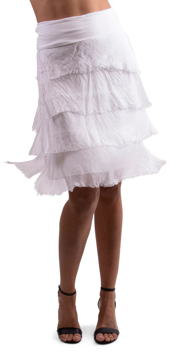 Expertly crafted in Italy, this 100% silk short ruffle skirt boasts a ruched sides waistband for a flattering fit. Its 95% viscose and 5% elastane lining ensures both comfort and style. With its versatile one size fits all design, this skirt is the perfect addition to any wardrobe.