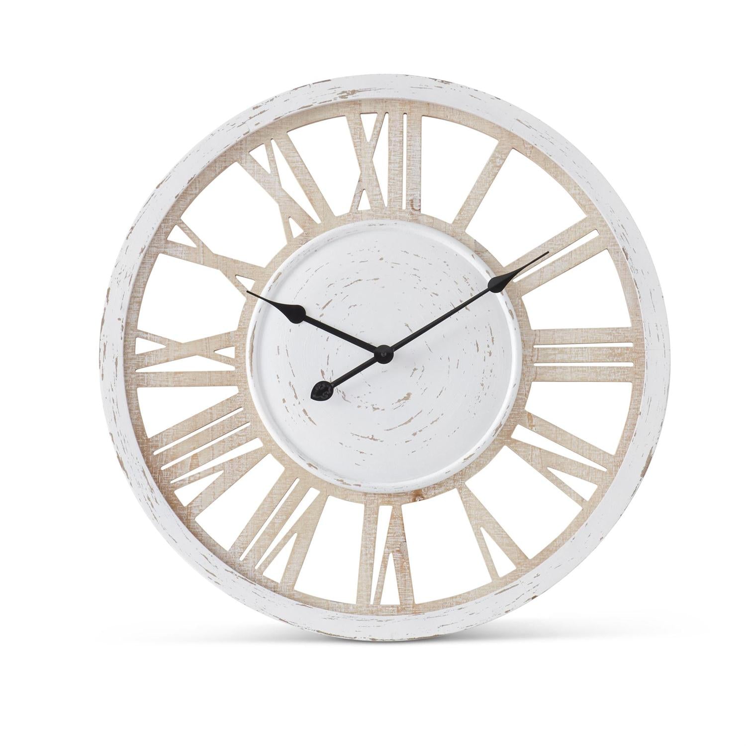 This 26.75-inch wall clock features a sleek white and natural wood design. With a large size and easy-to-read numbers, it makes keeping track of time effortless. Stylish and functional, this clock is the perfect addition to any room.