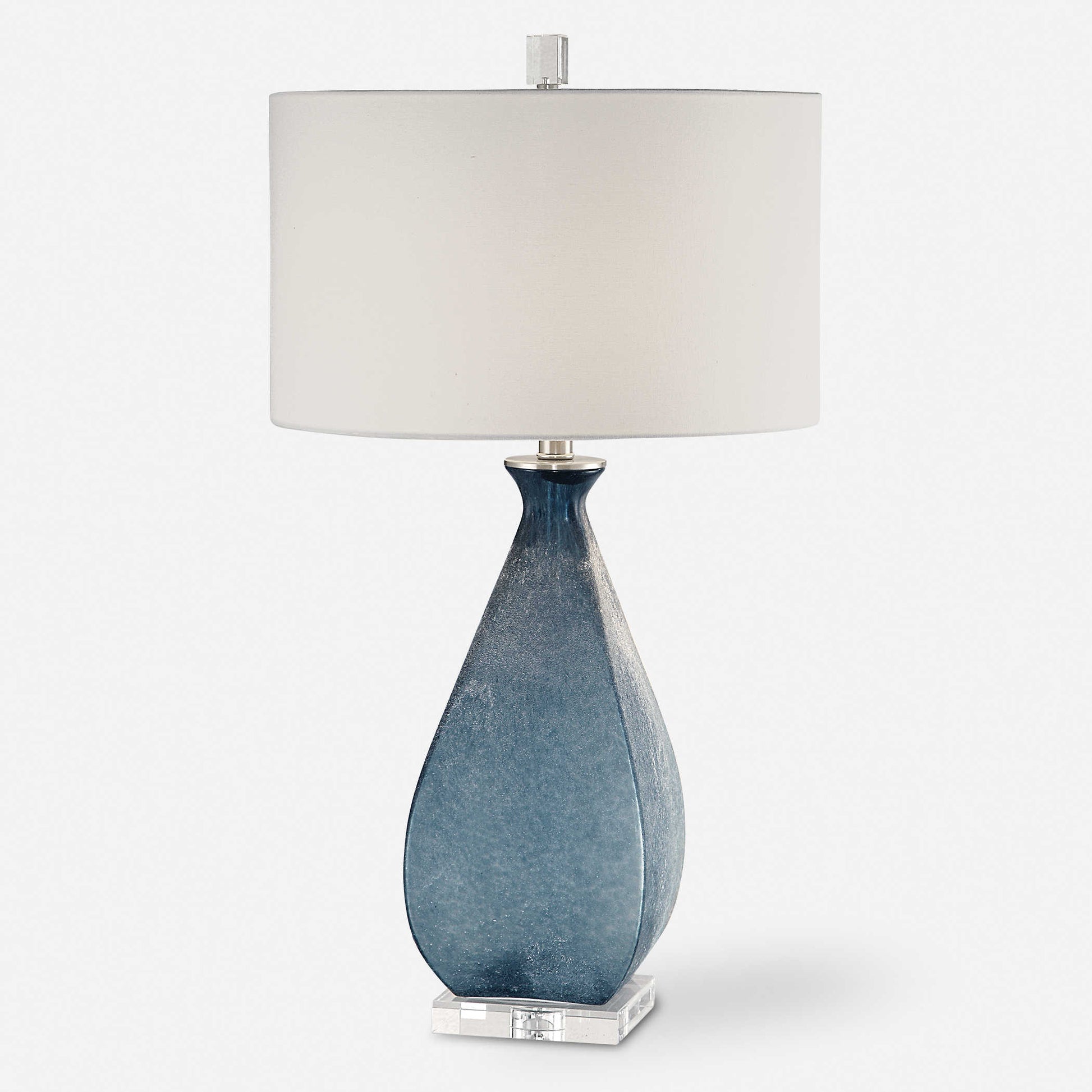 Unpolished, charcoal gray glass, featuring a subtle twist shape, accented with brushed nickel highlights and crystal details. The round hardback drum shade is a light beige linen fabric with natural slubbing and matching double trim.