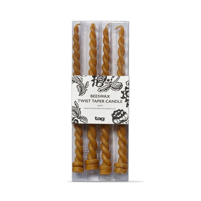 Beautiful set of 4 twisted beeswax candles. These 10" tapers add just a classic element to your decor.
