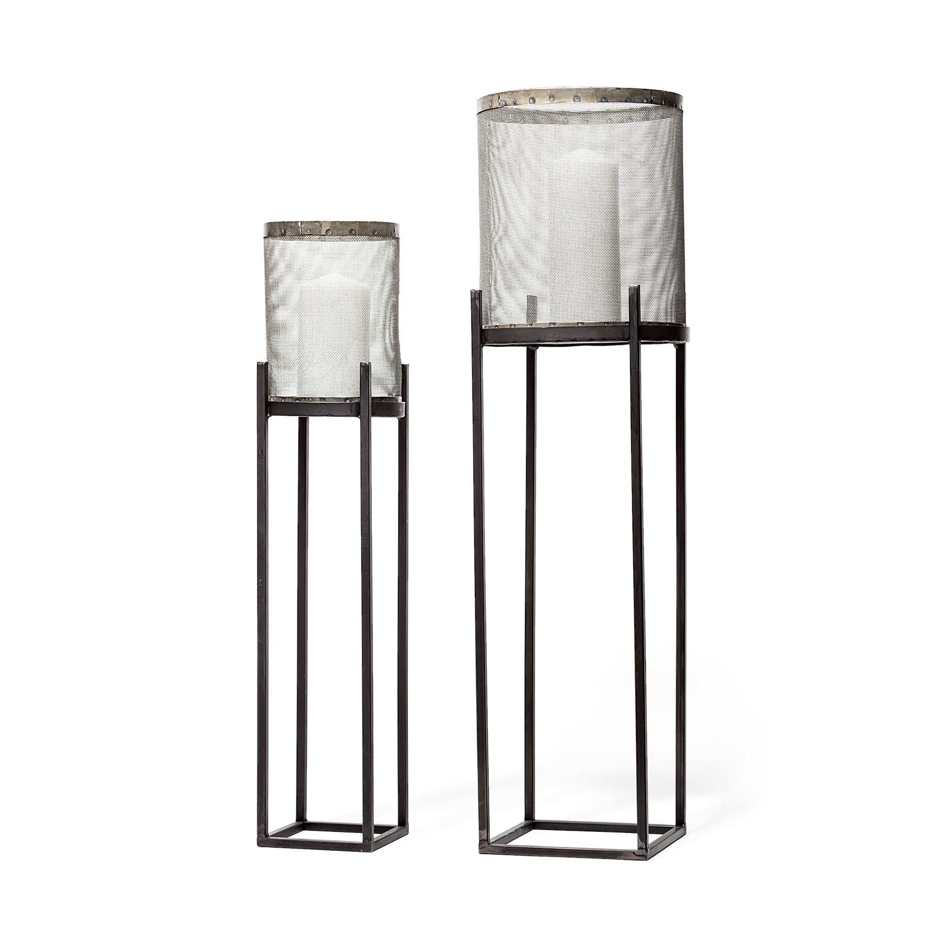 The Steen is a set of two stunning floor lanterns, each featuring a candle sleeve rested atop a stylish, metallic base.