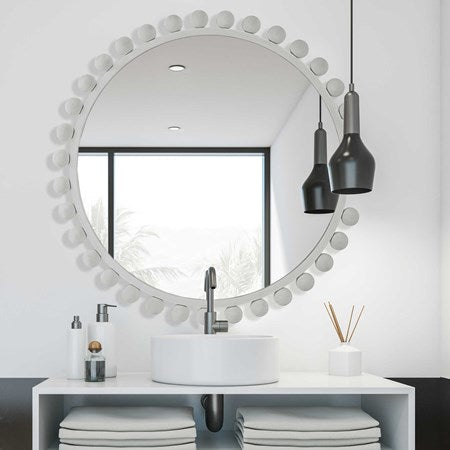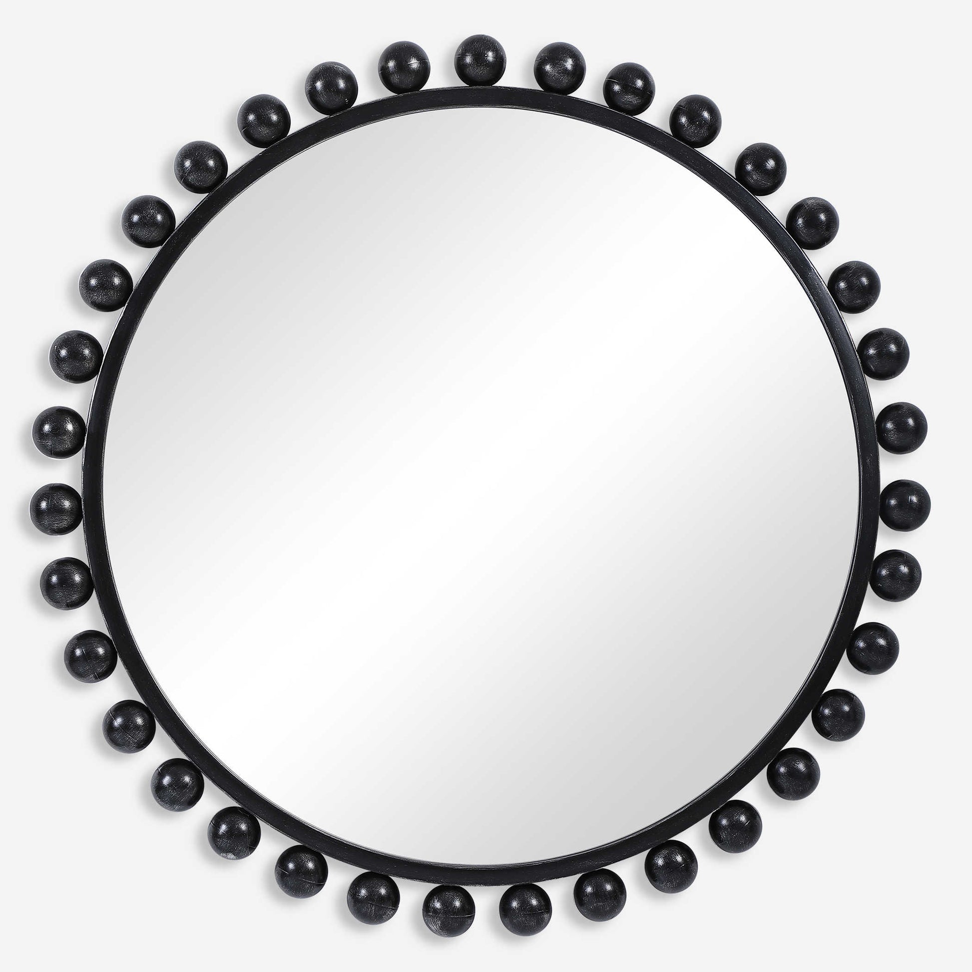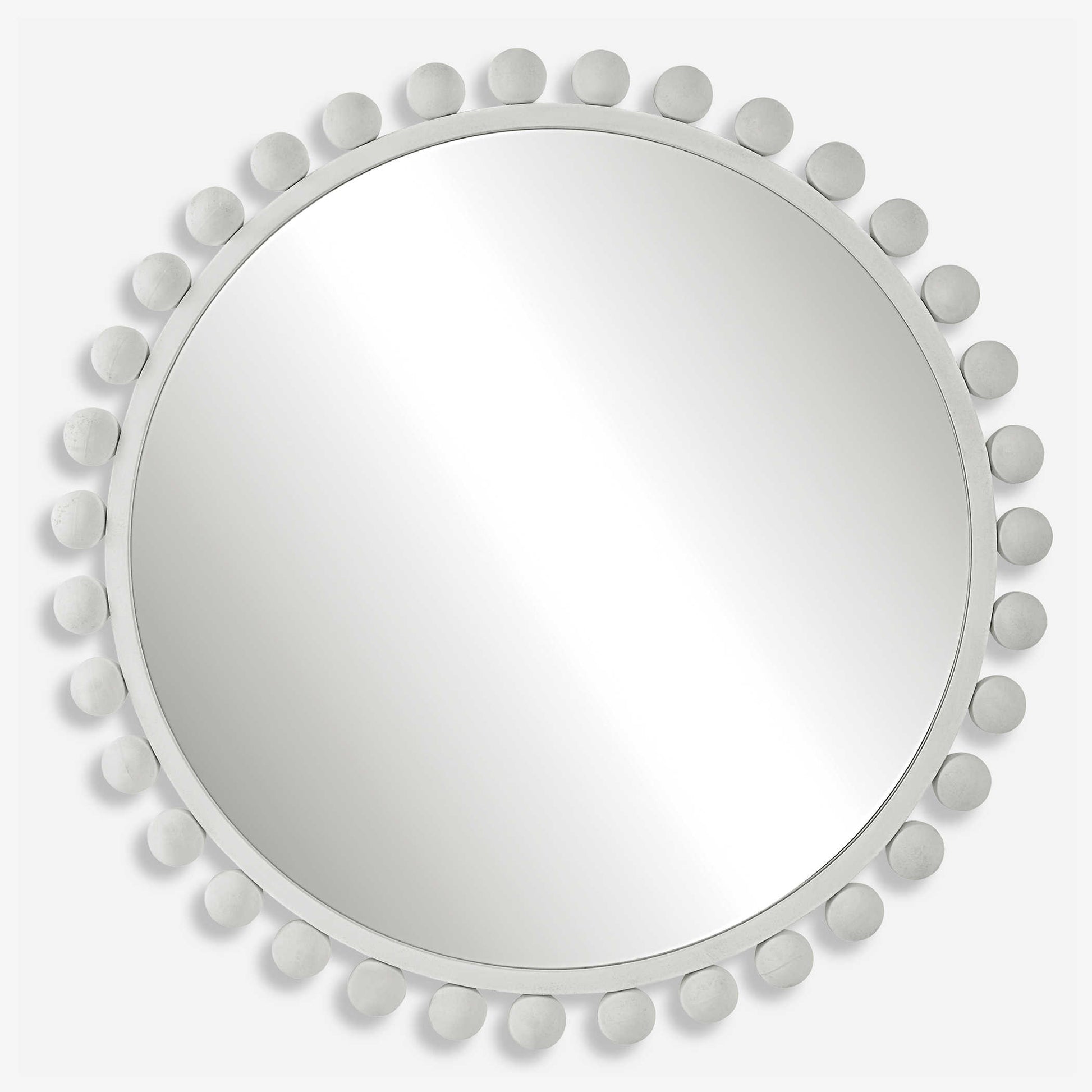 This eye-catching round mirror adds an upscale look and sophisticated style to any room by showcasing smooth iron spheres that embellish a sleek inner frame, finished in a clean matte white, black and gold.