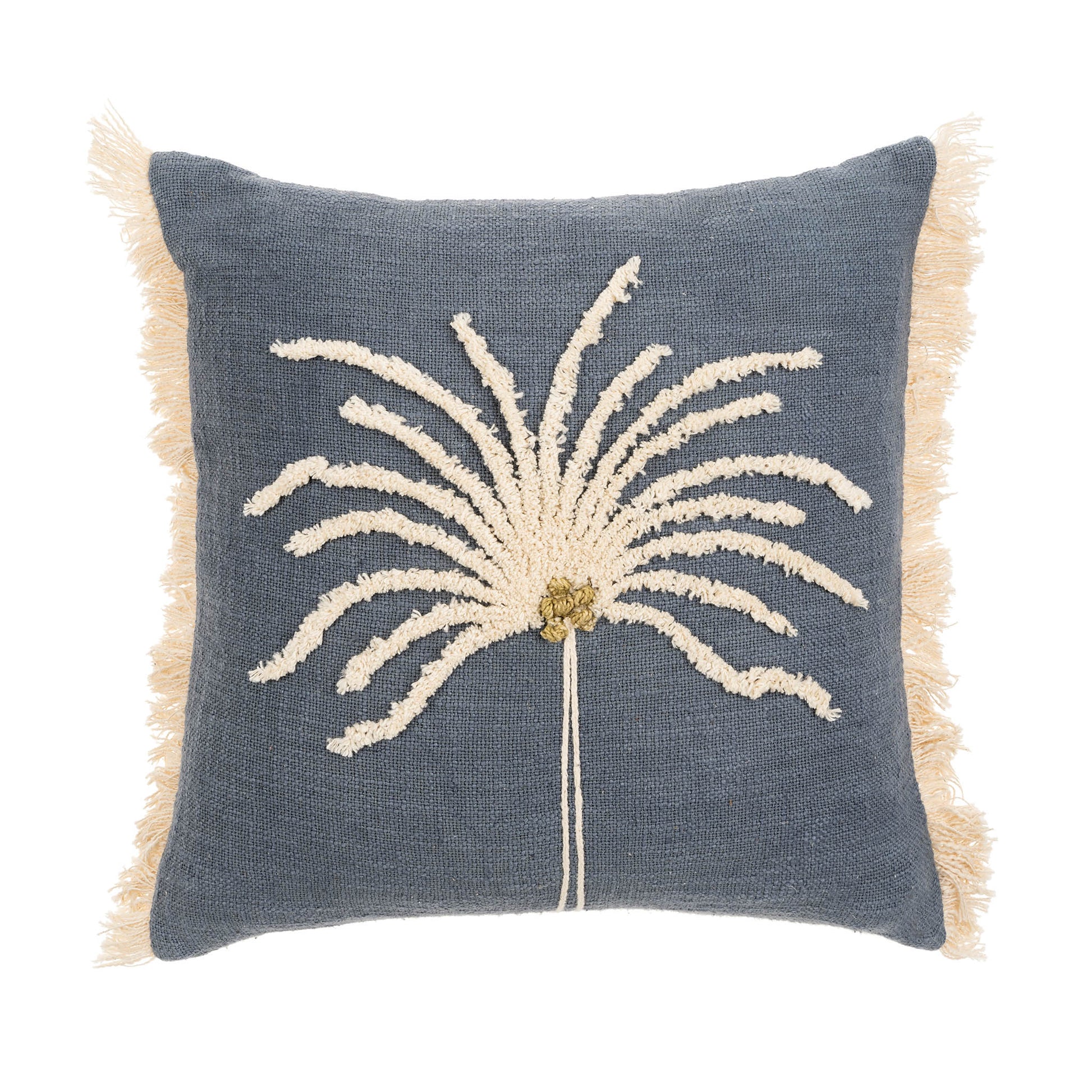 Add a touch of nature-inspired charm to your child's room with the Palm Pillow. Featuring detailed stitching and frayed edges, the palm tree design appears lively and engaging. The calming deep blue color pairs effortlessly with various decor styles. Crafted from thick, plush materials, this durable pillow provides comfort and lasting quality. Filled with premium Responsible Down Standard (RDS) certified feathers and down, it reflects a commitment to ethical sourcing. For optimal care, hand washing is recommended.