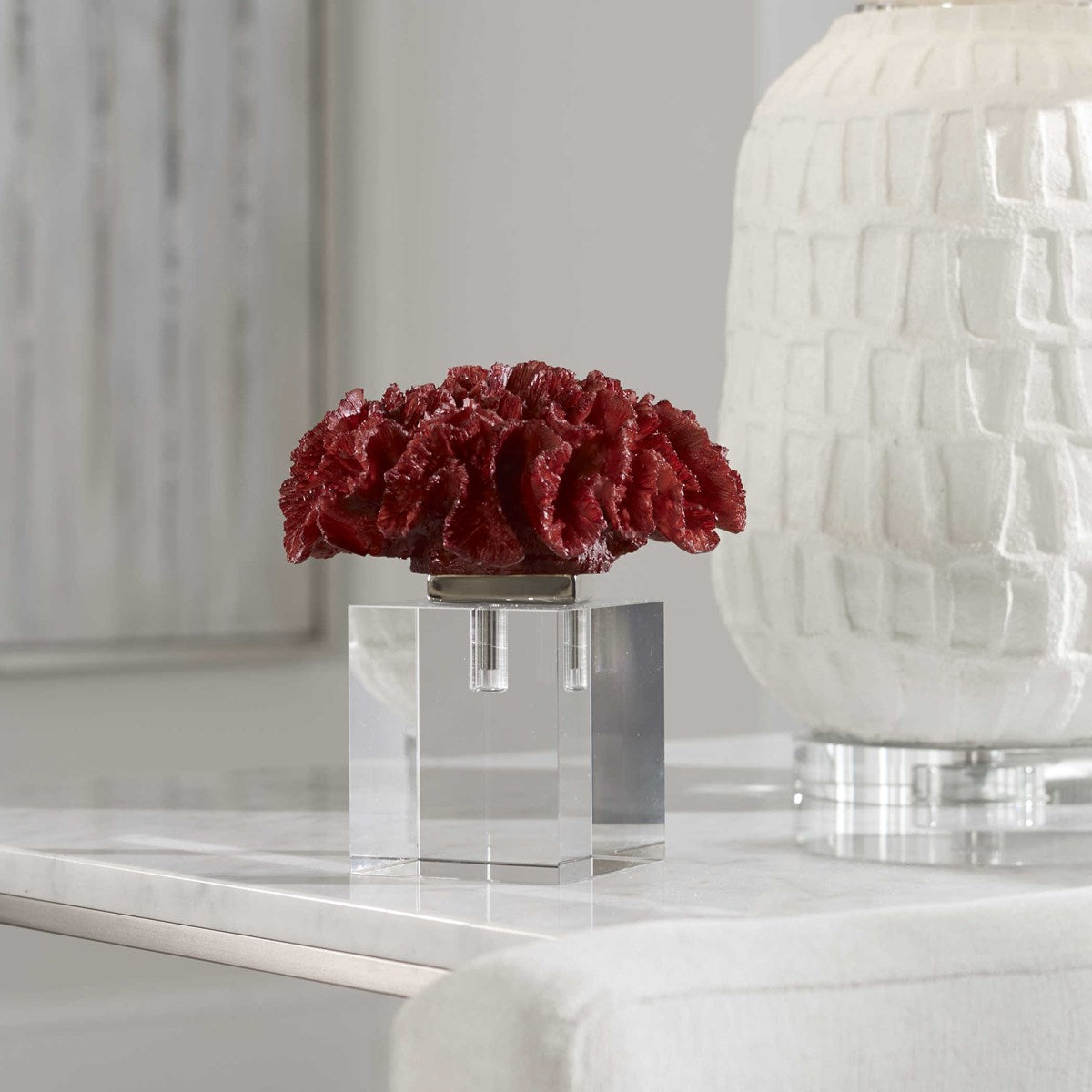 The body is cast directly from a rare red coral cluster, seated on a large crystal cube. Natural beauty at its finest. Crafted from a one-of-a-kind red coral cluster, this piece showcases the unique patterns and colors found in nature. Each piece is a testament to the wonder of the natural world, and a stunning addition to any collection.