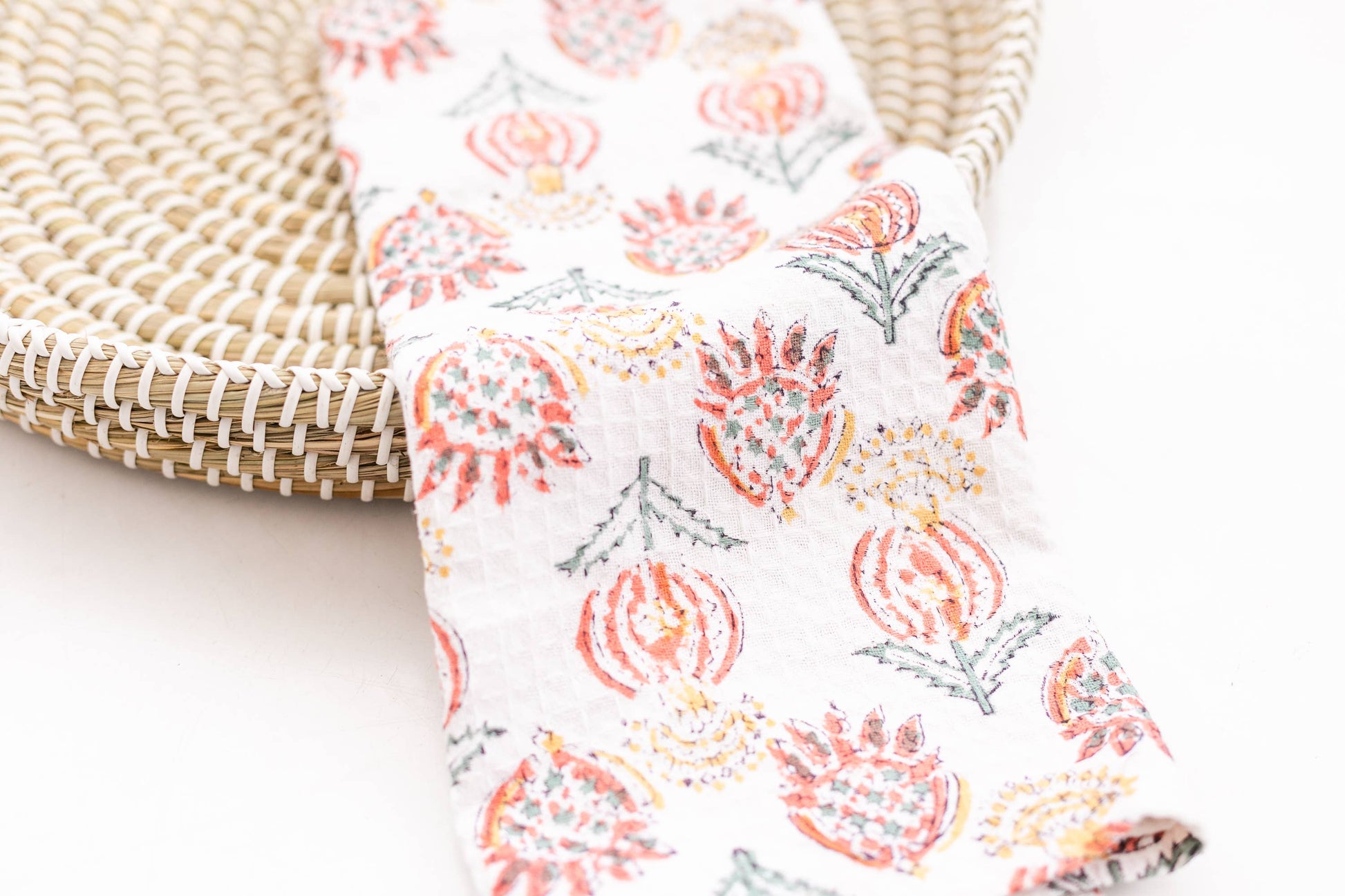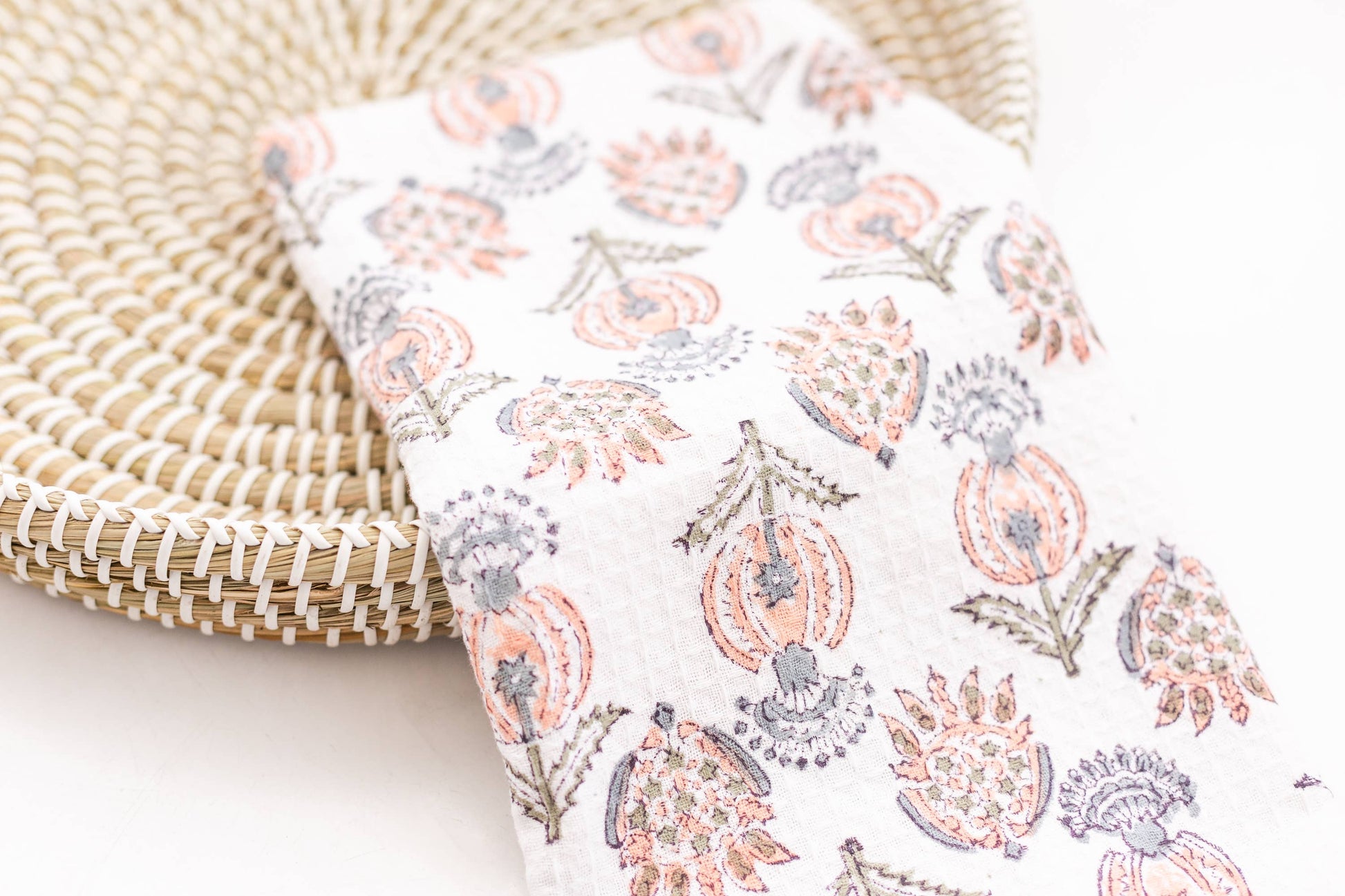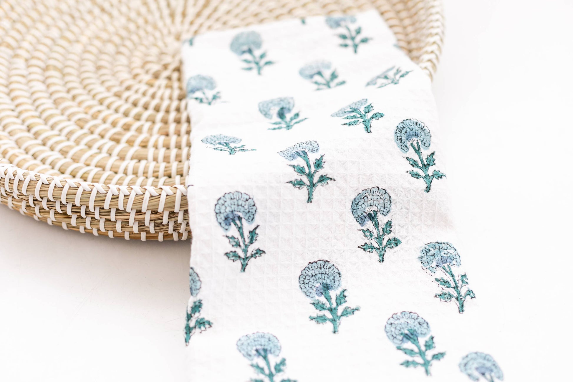 Our lightweight and luxurious cotton waffle tea towels are crafted using traditional woodblock printing, an integral part of India's colorful material and visual culture. Machine washable and gentle on skin, hand block printing is a centuries-old art form prevalent in India, East Asia, and beyond. The process involves carving a teak wood block and using it to stamp dye onto cotton or silk creating an unmistakable handmade feel. The magical land of Rajasthan, India home of maharajas, medieval forts, and palaces is where our artisan partner creates these exquisite, Fair-Trade products.