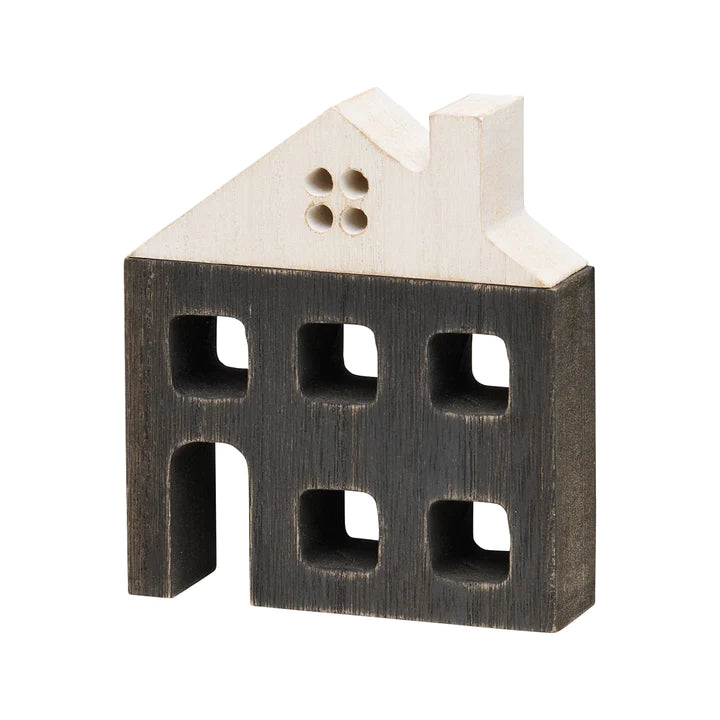 Small Black and White Washed Wood Plank House with Windows and Door Cutout.