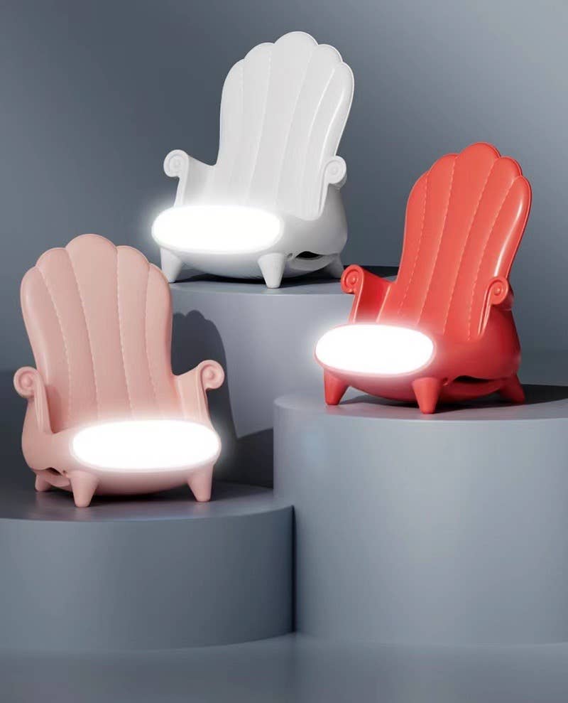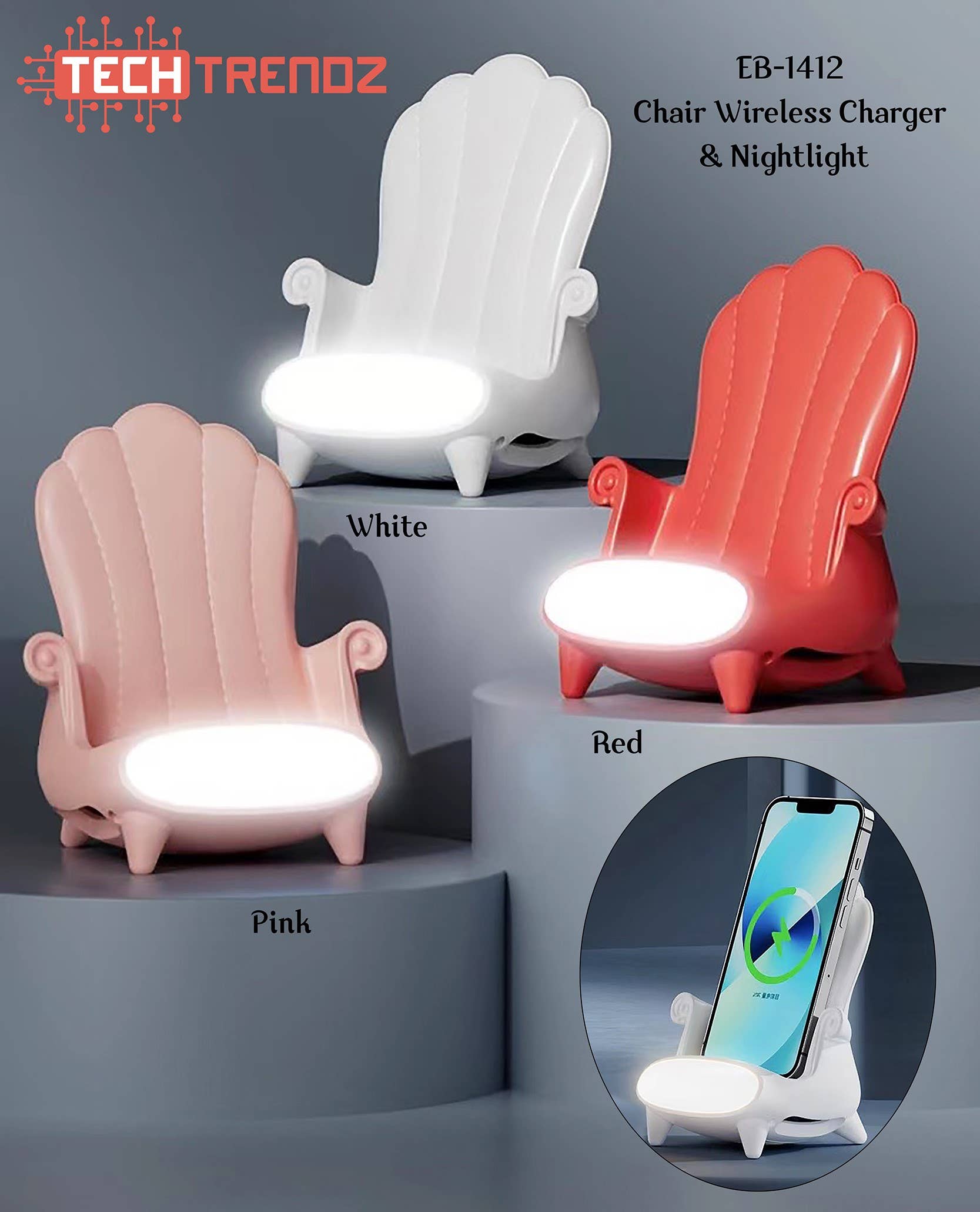 This product features a wireless charger in the shape of a chair, complete with a night light that offers three different lighting options: warm, soft, and white. Compatible with both iPhone and Android phones.