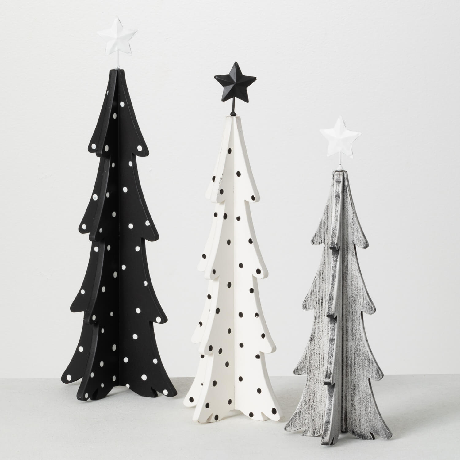Dimensional with a modern flair of whimsy, this trio of wooden trees with metal star toppers is a fun way to decorate a shelf for the season without overdoing the classic red and green. Measuring 14.5" to 18" tall, they are a simple decoration that fits in anywhere.